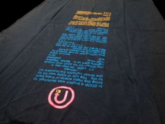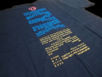 阪神淡路大震災の後、街並が次々復興していく中で、なかなか元に戻らないお洒落で楽しかった神戸の夜を復活させようと立ち上がった有志による集まり「KYKK(金曜の夜は神戸で決まり)」のスタッフTシャツです。