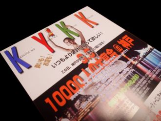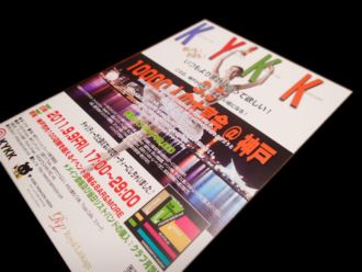 阪神淡路大震災の後、神戸の夜を復活させようと立ち上がった有志による集まり「KYKK(金曜の夜は神戸で決まり)」が神戸に10000人を集めようと企画したイベントの協力店舗に置いていただくフライヤーです。共通ビジュアルのポスターとセットで受注しました。