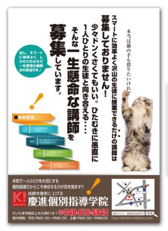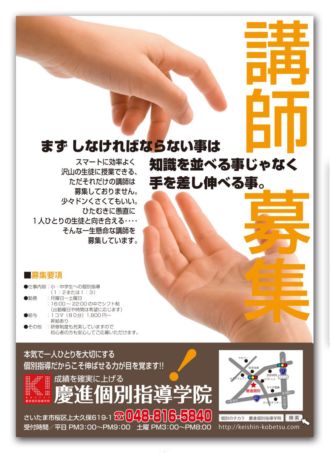塾の講師を募集するためのポスティング用チラシですが、塾のイメージアップをはかる情動広告を兼ねています。