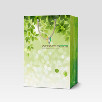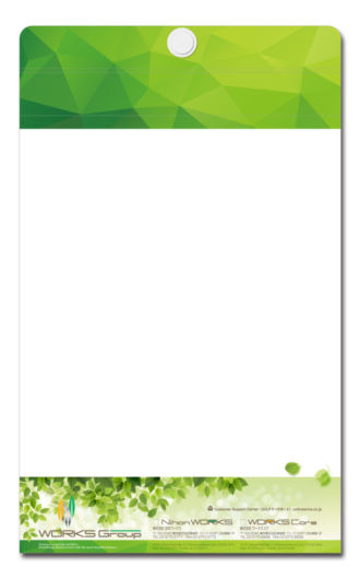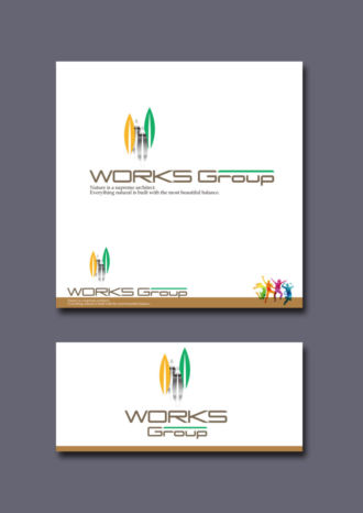 計4枚の葉でWORKS Group様の頭文字Wを表現しております。また、真っ直ぐな大地を【WORKS Group】の文字で形成し、4枚の葉が天に向かって躍動する建築物を抽象的に表現しております。